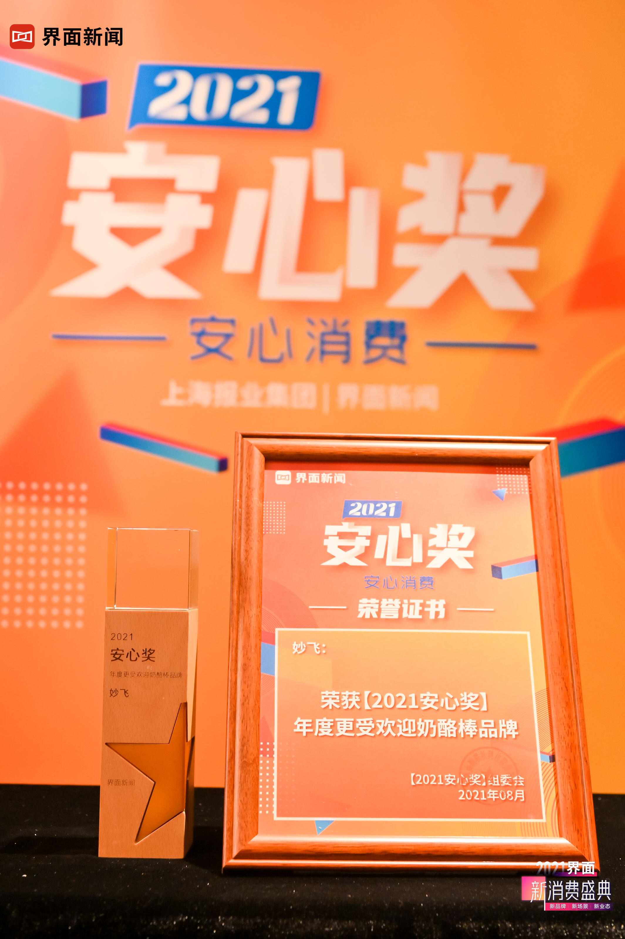 8月5日,上海报业集团|界面新闻在上海静安瑞吉酒店举办了【2021安心奖】颁奖典礼。妙飞凭借其牢固的食品安全防线和精益求精的研发态度,荣膺年度更受欢迎奶酪棒品牌。